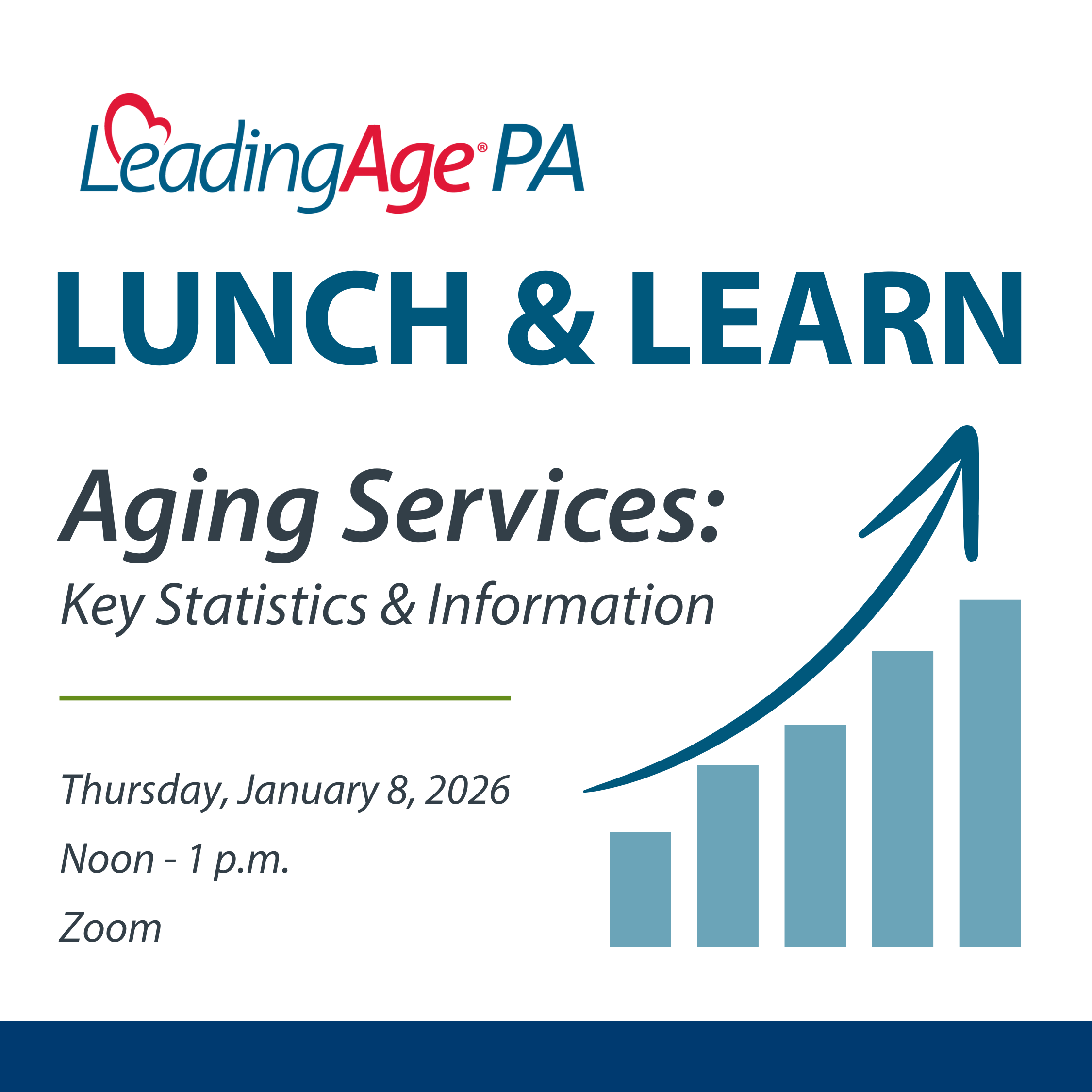 Lunch & Learn: Exploring "Aging Services: Key Statistics and Information"January 8, 2026 12:00 PM to 1:00 PMJoin LeadingAge PA and Holleran Consulting for a virtual Lunch & Learn highlighting our new resource, Aging Services: Key Statistics and Information. This session provides an overview of key Pennsylvania aging services data, including demographics, workforce trends, senior living settings, HCBS, and LIFE/PACE. Ideal for providers looking to strengthen decision-making and advocacy with reliable statewide data. -